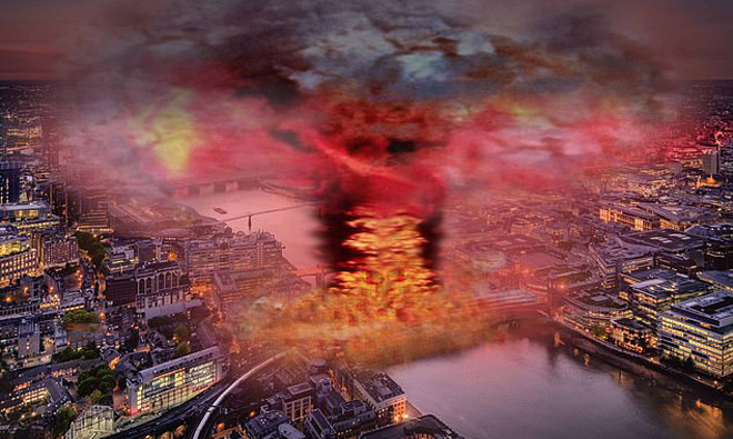 | Tranh vẽ mô tả trung tâm London bị tấn công hạt nhân. |