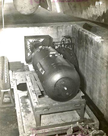 | Quả bom nguyên tử Little Boy lúc chuẩn bị đưa lên máy bay B-29. |