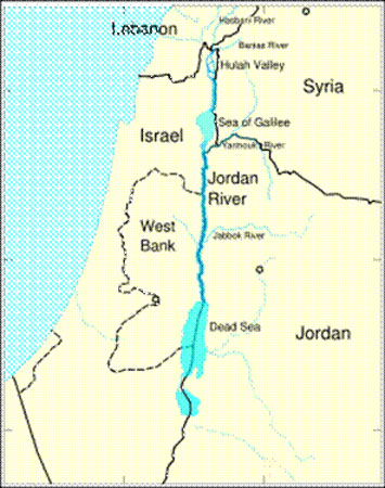 | Bản đồ lưu vực sông Jordan và nhánh Yarmouk trù phú - một trong những nguyên nhân gây tranh chấp dai dẳng tại Trung Đông. |