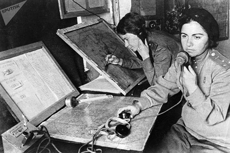 | Một nữ điện đài viên nhận tin báo từ vùng bị phát xít chiếm đóng. |
