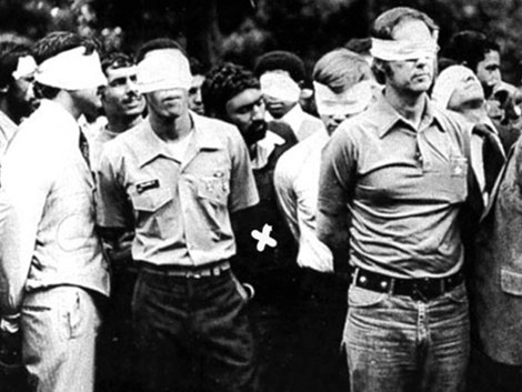 | Renato Curcio (x) chỉ huy Lữ đoàn Đỏ đứng giữa những con tin bị bắt cóc. |