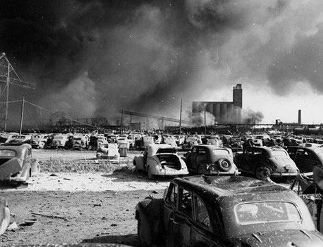 Chiếc tàu vận tải nọ giờ trở thành một quả lựu đạn 10.000 tấn với hàng trăm nghìn mảnh vụn kim loại nóng bỏng - cháy rực cùng âm thanh rít réo tràn ngập không trung. Dãy nhà kho bê tông của cảng và các tháp khoan dầu bên bờ vịnh đổ sập xuống như bị phạt ngang.