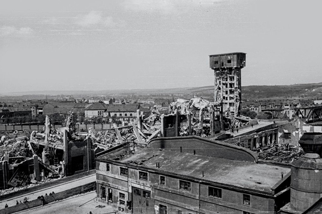 Tàn tích của khu phức hợp nhà máy sản xuất vũ khí Skoda Works vào tháng 7 năm 1945.  Ảnh tư liệu: Lưu trữ nhà nước ở Pilsen.