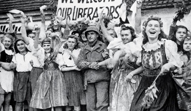 Người Séc mặc đồ truyền thống đón lính Mỹ tới Pilsen vào năm 1945, nơi có nhà máy Skoda Works tọa lạc. Ảnh nguồn: Mondadori / Getty Images.