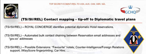 Một tài liệu PowerPoint năm 2010 của GCHQ còn tiết lộ JTRIG triển khai chương trình "Royal Concierge" (Người gác cổng Hoàng gia) thường xuyên giám sát những đăng ký giữ chỗ trước của hệ thống khách sạn để xác định nơi xuất phát của các nhà ngoại giao nước ngoài và gửi "cảnh báo hàng ngày đến bộ phận chuyên gia phân tích chịu trách nhiệm về các mục tiêu phức tạp của chính quyền".