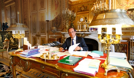 | Tổng thống F. Hollande làm việc trong Phòng Vàng. |