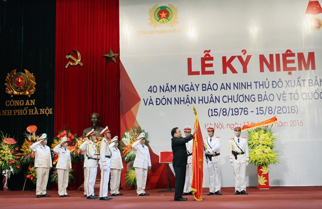 Đồng chí Hoàng Trung Hải, Bí thư Thành ủy Hà Nội gắn Huân chương Bảo vệ Tổ quốc hạng Nhì lên là cờ truyền thống Báo ANTĐ. |