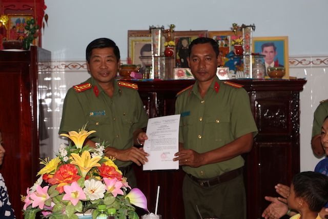 | Đại tá Nguyễn Văn Hiểu, Phó Giám đốc Công an tỉnh Vĩnh Long trao quyết định trao tặng nhà tình nghĩa cho đồng chí Thạch Chí Trung. |