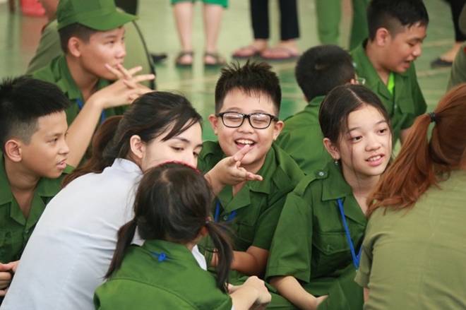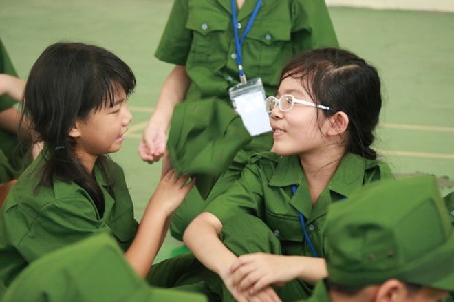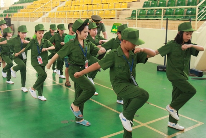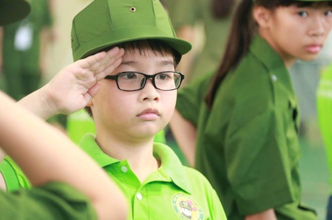 Tại đây, các em được tập điều lệnh về đội ngũ như tập hợp hàng ngũ, đi đều, đi nghiêm và tập gấp chăn màn, quần áo,...