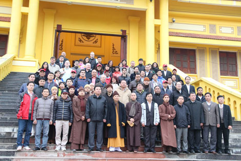 | Đoàn đại biểu Đại sứ đại diện ngoại giao và Cảnh sát các nước tại Việt Nam chụp ảnh lưu niệm cùng Công an Việt Nam tại Học viện Phật giáo Việt Nam. |