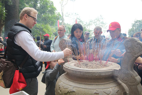 | Khách quốc tế dâng hương thành kính lên các vua Hùng. |