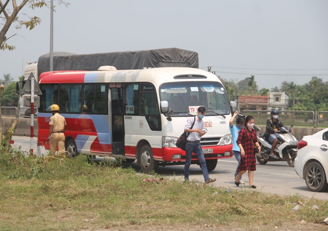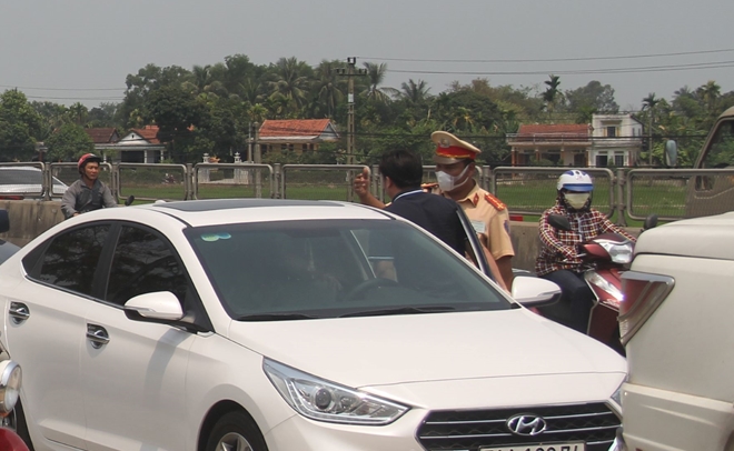 Tại chốt kiểm soát y tế đoạn giao với đường tránh TP Huế (phường Hương Văn, thị xã Hương Trà), trong sáng 21/3, lực lượng CSGT Công an tỉnh Thừa Thiên Huế làm nhiệm vụ tại đây đã dừng hàng trăm phương tiện, trong đó phần lớn là ô tô chở khách để kiểm tra và mời người dân vào chốt kiểm soát để cán bộ y tế đo thân nhiệt, kê khai tờ khai y tế.