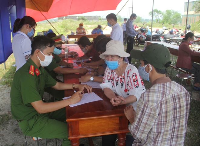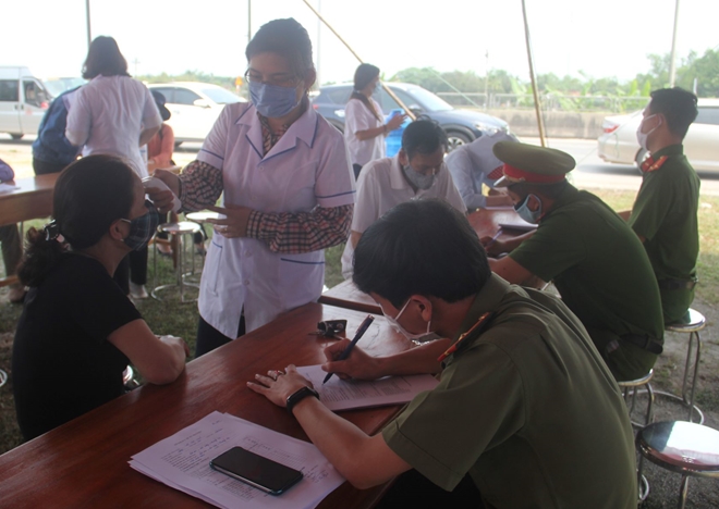 CBCS Công an phối hợp làm nhiệm vụ kiểm tra sức khỏe, viết tờ khai y tế cho người dân tại chốt kiểm soát y tế ở thị xã Hương Trà. |