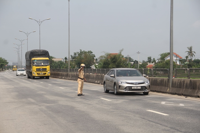 CBCS Đội số 1 Phòng CSGT Công an tỉnh Thừa Thiên Huế ra tín hiệu dừng xe yêu cầu tài xế vào chốt kiểm soát y tế để kiểm tra. |