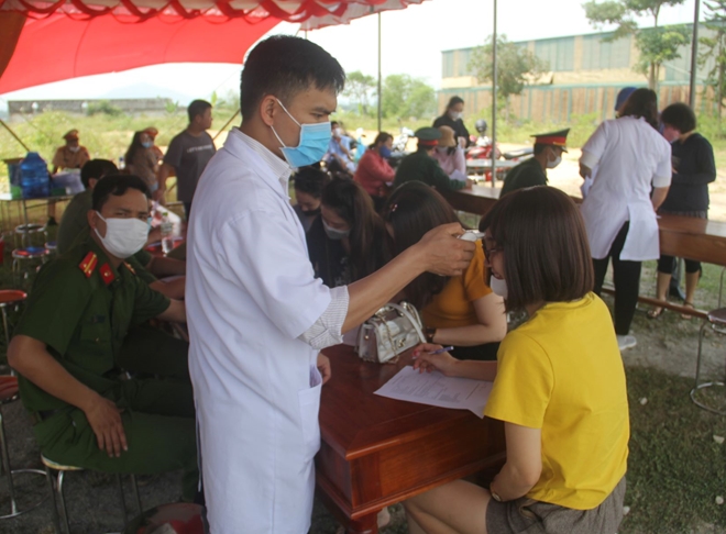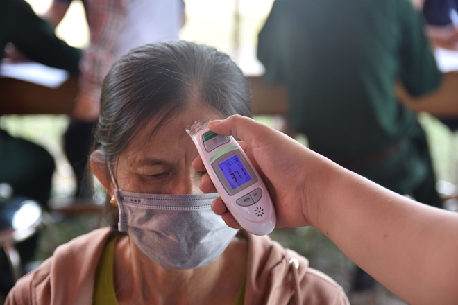 Người dân được cán bộ y tế đo thân nhiệt tại các chốt kiểm soát y tế. |
