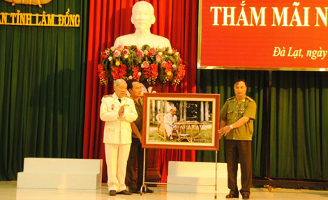 | Thiếu tướng Phan Văn Lai tặng quà của đoàn cho Công an tỉnh Lâm Đồng. |