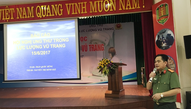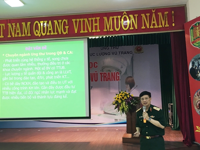 Phát biểu tại hội thảo, Trung tướng GS.TS. Phạm Quang Cử nhấn mạnh: Những năm gần đây số lượng bệnh nhân ung thư trong và ngoài LLVT ngày càng gia tăng, trở thành vấn đề lớn trong công tác điều trị và dự phòng tại các cơ sở y tế của LLVT. Thực tế trên đặt ra yêu cầu hợp tác giữa các chuyên gia về ung thư nói chung, trong LLVT nói riêng, để chất lượng chẩn đoán và điều trị càng được nâng cao, đáp ứng yêu cầu khám, chữa bệnh của CBCS và nhân dân.