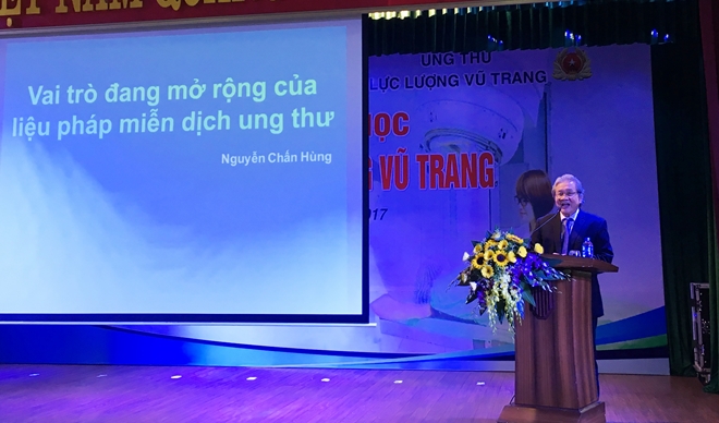 GS. Nguyễn Chấn Hùng mang đến thông tin mới về "Vai trò mở rộng của liệu pháp miễn dịch ung thư". Đây là lĩnh vực mới mẻ khi dùng các tế bào của chính hệ miễn dịch của người bệnh để khống chế căn bệnh. Theo đó, các tế bào T là các “chiến sĩ” chủ chốt có khả năng loại bỏ ung thư. Các tế bào ung thư phơi bày các dấu ấn (kháng nguyên) có thể bị các tế bào dạng cây phát hiện. Các tế bào dạng cây kích hoạt các tế bào T thành các tế bào sát thủ nhận biết và diệt ung thư.