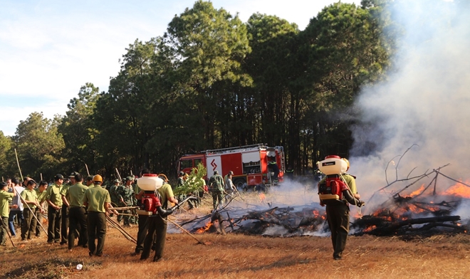 | Cán bộ, chiến sĩ phòng Cảnh sát PCCC và CNCH tham gia diễn tập chữa cháy rừng. |