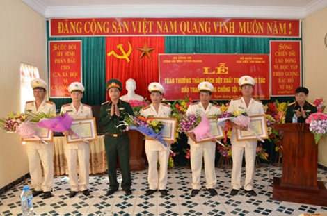 | Thiếu tướng Phạm Văn Thi, Cục trưởng Cục điều tra hình sự, Bộ Quốc phòng trao Bằng khen tặng 5 CBCS Công an tỉnh Tuyên Quang. |