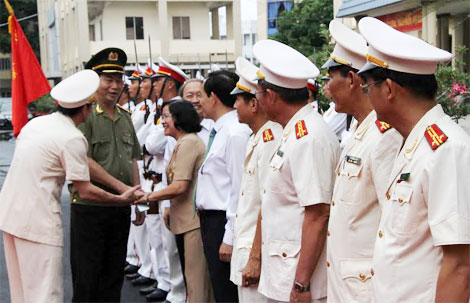 Đại tướng Trần Đại Quang, Ủy viên Bộ Chính trị, Bộ trưởng Bộ Công an chúc mừng các đồng chí lãnh đạo tỉnh Tây Ninh và cán bộ chủ chốt Công an tỉnh.