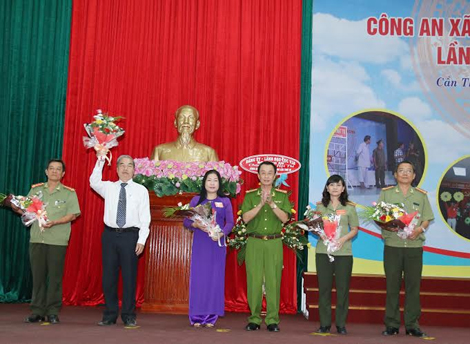 | Đại tá Huỳnh Đấu Tranh - Phó Giám đốc Công an TP.Cần Thơ, tặng hoa Ban giám khảo Hội thi. |
