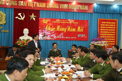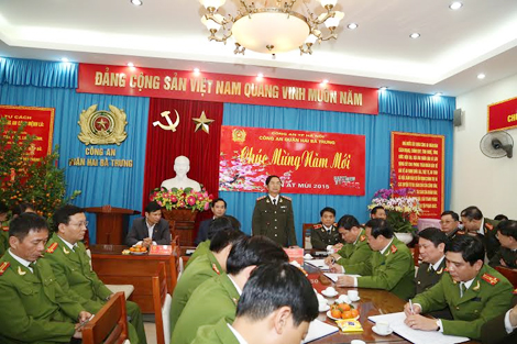 Đại tá Đinh Huy Hoàng, Trưởng Công an quận Hai Bà Trưng đã báo cáo kết quả công tác năm 2014; nhiệm vụ công tác năm 2015 và công tác trực ban, trực chiến đảm bảo cho nhân dân vui Xuân, đón Tết; cũng như triển khai ngay chỉ đạo của Bộ Công an, Công an TP Hà Nội về nhiệm vụ đảm bảo ANTT sau dịp nghỉ Tết Nguyên đán Ất Mùi 2015.