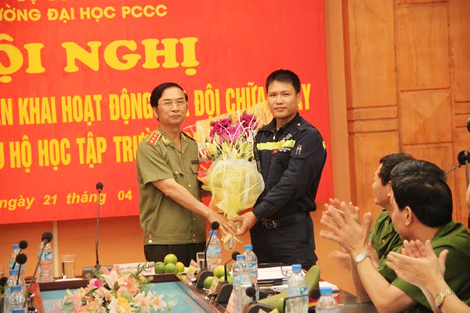 | Thứ trưởng Thường trực Đặng Văn Hiếu tặng hoa cho Đội Chữa cháy và CHCN học tập. |