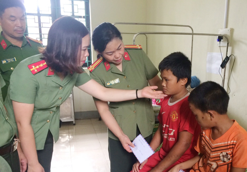 CBCS Công an Lai Châu thăm khám tặng quà 2 em nhỏ bị thương.