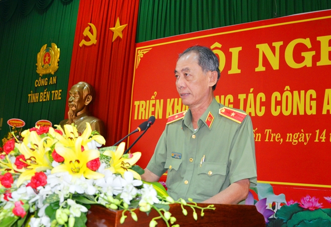 | Thiếu tướng Nguyễn Văn Hoàng, Giám đốc Công an tỉnh Bến Tre phát biểu tại Hội nghị. |