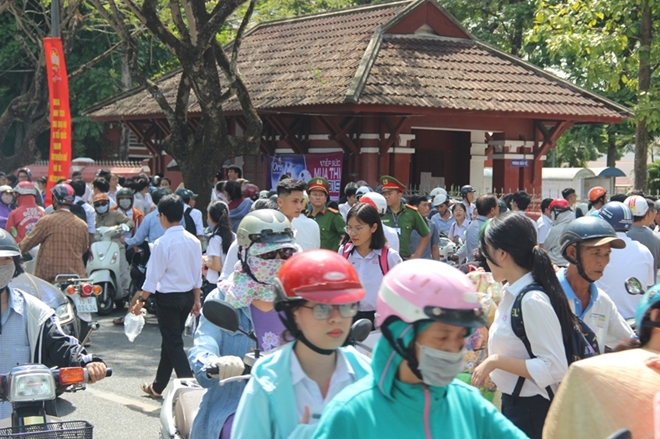 Phụ huynh chờ đợi thí sinh trước điểm thi trường THPT Quốc học Huế. |