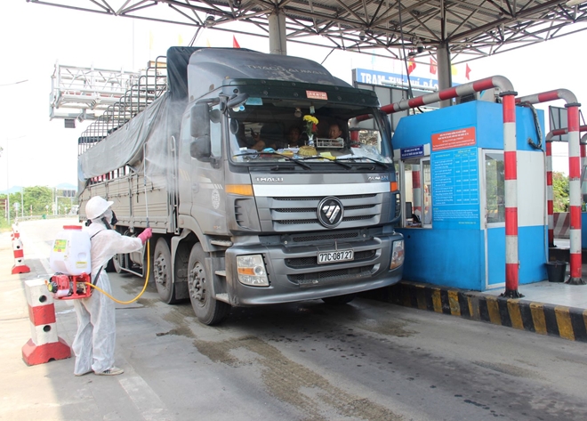 Phun thuốc khử trùng các phương tiện lưu thông qua trạm thu phí Bắc Hải Vân. |
