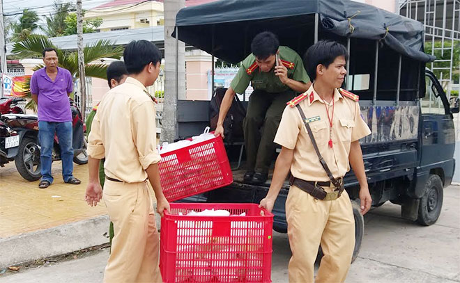 | Công an huyện Mỹ Tú mang cơm đến cổng trường phát cho các em học sinh nghèo đi thi. |