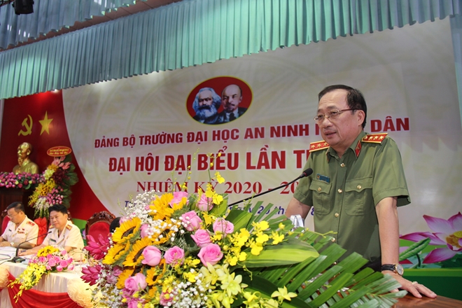 Thứ trưởng cũng đồng tình với phương châm của Đảng bộ nhà trường đã đề ra: "Đoàn kết, dân chủ, kỷ cương, đổi mới, phát triển” cũng như Chủ đề của đại hội là: "Xây dựng đảng bộ trường ĐH ANND trong sạch vững mạnh toàn diện, nâng cao chất lượng giáo dục đào tạo và trở thành một trung tâm đào tạo NCKH uy tín của lực lượng CAND.