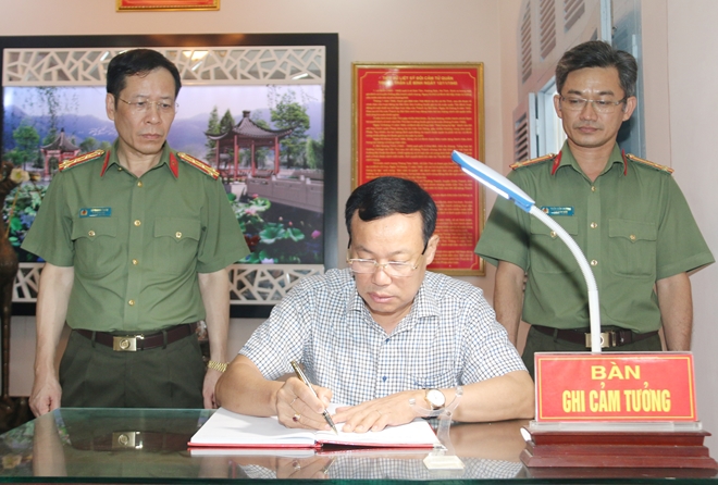 | Thứ trưởng Lê Tấn Tới ghi sổ cảm tưởng tại Nhà truyền thống Công an Cần Thơ. |