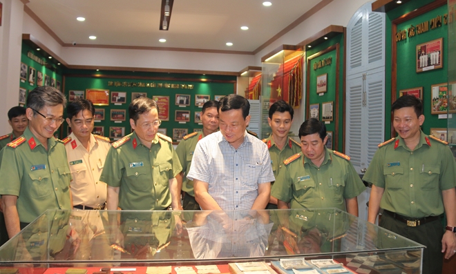| Thứ trưởng Lê Tấn Tới tham quan các hiện vật trưng bày tại Nhà truyền thống Công an Cần Thơ. |