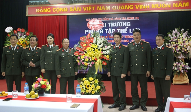 | Các đồng chí lãnh đạo Cục Công tác đảng và công tác chính trị chúc mừng cán bộ chiến sĩ trong ngày khai trương phòng tập |
