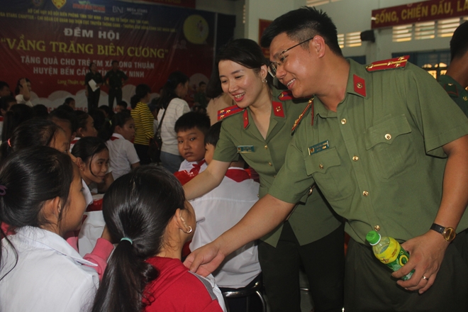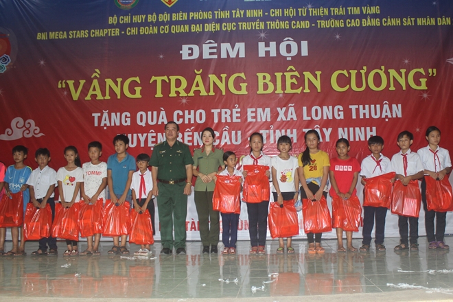 | Đại diện Bộ đội biên phòng tỉnh Tây Ninh và đại diện Đoàn thanh niên Chi đoàn Cơ quan đại diện Cục truyền thông CAND trao quà cho các em |