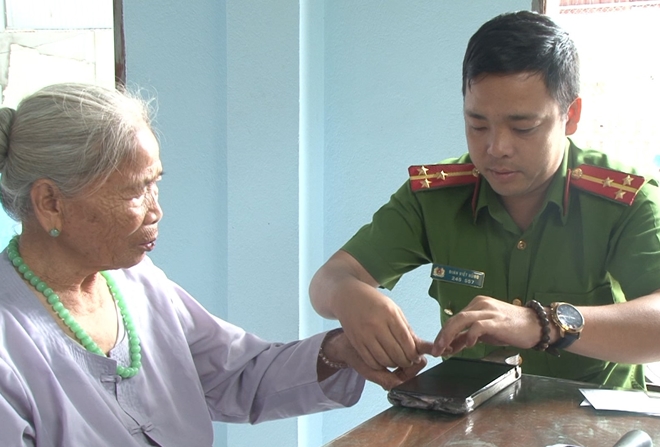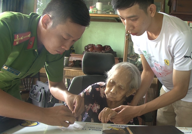 | Đội Cảnh sát QLHC về TTXH Công an TP Huế giúp cụ bà Trần Thị Kiểu (ở phường Phú Bình TP Huế) làm thủ tục đổi giấy CMND. |