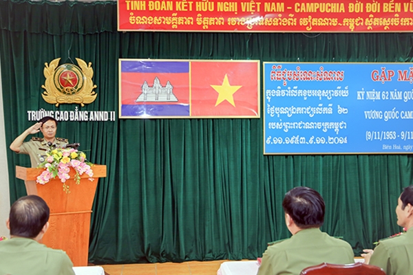 Đại tá, Tiến sĩ Lê văn Thiện - Bí thư Đảng ủy, Hiệu trưởng Trường Cao đẳng ANND II đã nhiệt liệt chúc mừng những thành tựu mà nhân dân Campuchia đạt được trong 62 năm qua và biểu dương sự nỗ lực, phấn đấu học tập, nghiên cứu của học viên Campuchia tại trường. Đồng thời, đồng chí Hiệu trưởng sẻ chia niềm tự hào về mối quan hệ “Láng giềng tốt đẹp, hữu nghị truyền thống, hợp tác toàn diện, bền vững lâu dài” giữa hai đất nước Việt Nam - Campuchia.