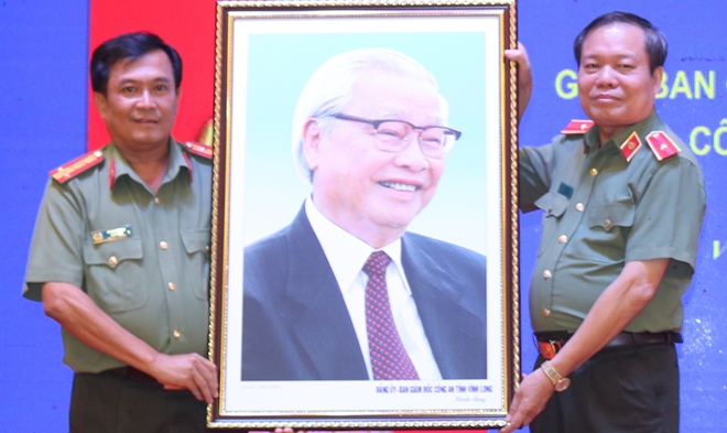 | Đại tá Đoàn Minh Lý, Giám đốc Công an tỉnh Vĩnh Long tặng bức tranh chân dung cố Thủ tướng Võ Văn Kiệt đến lãnh đạo Cục Công tác đảng và công tác chính trị. |
