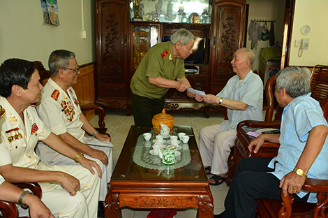 Thay mặt đoàn công tác, Thiếu tướng Phan Văn Lai chuyển lời thăm hỏi và trao tặng 10 suất quà (mỗi xuất 2 triệu đồng) của lãnh đạo Bộ Công an tới các đồng chí chi viện cho chiến trường Miền Nam tại Tuyên Quang.