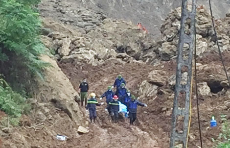 | Lực lượng tìm kiếm đưa thi thể các nạn nhân trong vụ sạt lở đất ở xóm Khanh, xã Phú Cường, huyện Tân Lạc, Hòa Bình ra ngoài. |