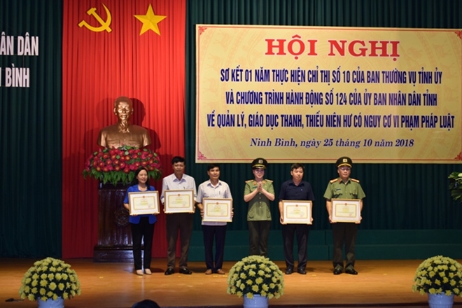 Tại Hội nghị, 5 tập thể, 6 cá nhân được Bộ Công an tặng Bằng khen; 10 tập thể, 10 cá nhân được UBND tỉnh Ninh Bình tặng Bằng khen vì có thành tích xuất sắc trong quản lý, giáo dục thanh, thiếu niên hư chậm tiến có nguy cơ vi phạm pháp luật.
