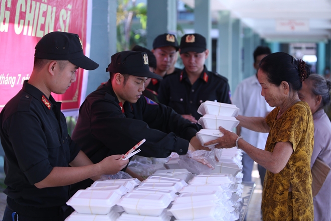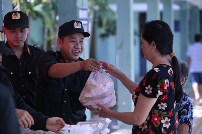 | Hàng trăm xuất cơm miễn phí được các cán bộ chiến sĩ CSCĐ Công an TP Đà Nẵng trao tận tay làm ấm lòng các thân nhân và bệnh nhân nghèo đang điều trị tại Trung tâm Y tế quận Cẩm Lệ (TP Đà Nẵng) vào ngày 14/7/2020. |