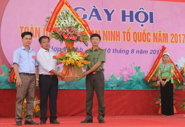 | Đại tá Hoàng Văn Toàn, Phó Cục trưởng Cục Xây dựng phong trào toàn dân bảo vệ ANTQ - Bộ Công an tặng hoa chúc mừng cho đại diện lãnh đạo Đảng bộ, chính quyền xã Hợp Thành. |