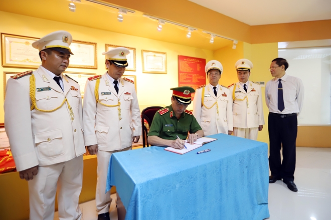 | Thứ trưởng Nguyễn Duy Ngọc ghi sổ lưu niệm sau lễ khai giảng tại Học viện CSND. |