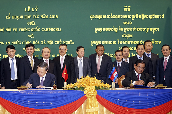 | Bộ trưởng Tô Lâm và Ngài Phó Thủ tướng, kiêm Bộ trưởng Bộ Nội vụ Sar Kheng đã ký kết Kế hoạch Kế hoạch hợp tác giữa Bộ Công an nước CHXHCN Việt Nam và Bộ Nội vụ Vương quốc Campuchia năm 2018. |