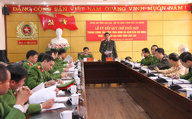 Ngày 8-11-2019, Công an tỉnh Lào Cai đã tổ chức Hội nghị ký kết Quy chế phối hợp giữa Công an tỉnh Lào Cai với Bộ Tư lệnh Cảnh sát Cơ động. Tham dự hội nghị còn có có Lãnh đạo Công an tỉnh và đại diện lãnh đạo Công an các đơn vị, địa phương.