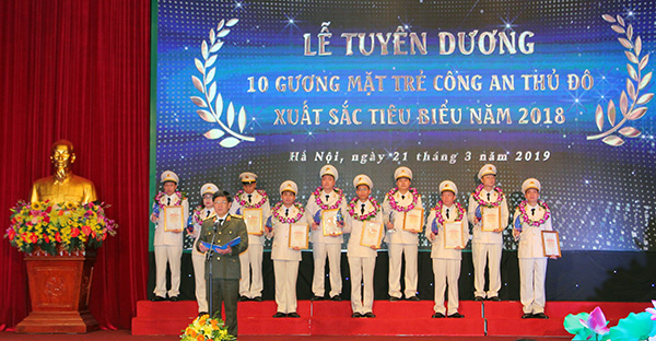 10 gương mặt trẻ xuất sắc tiêu biểu năm 2018 của Công an Thủ đô được vinh danh: 1. Đại úy Đỗ Văn Bình, Đội 4, Phòng Cảnh sát Kinh tế, CATP Hà Nội. 2.Thượng úy Hoàng Anh Trung, Phó trưởng CAP Hàng Mã, Công an quận Hoàn Kiếm. 3.Thượng úy Nguyễn Văn Hạnh, Đội 6, Phòng An ninh đối ngoại, CATP Hà Nội. 4.Thượng úy Lê Văn Thành, Đội Cảnh sát Thi hành án hình sự và hỗ trợ tư pháp, Công an huyện Đông Anh. 5.Thượng úy Ngô Thái Sơn, Phó trưởng Công an phường Yên Phụ, quận Tây Hồ. 6.Đại úy Lê Thành Trung, Đội trưởng Đội Cảnh sát điều tra tội phạm về ma túy, Công an quận Bắc Từ Liêm. 7. Thiếu tá Lê Trọng Hiếu, Đội trưởng Đội Cảnh sát điều tra tội phạm về trật tự xã hội, Công an quận Đống Đa. 8.Đại úy Nguyễn Thị Thu Trang, Phó Đội trưởng Đội Cơ yếu, Bí thư Đoàn Cơ sở Phòng Tham mưu. 9.Thượng úy Nguyễn Văn Tiến, Đội CSGT số 12, Phòng CSGT - CATP Hà Nội 10.Thượng úy Hoàng Kiên Quyết, Đội Giám định tài liệu, Phòng Kỹ thuật Hình sự, |